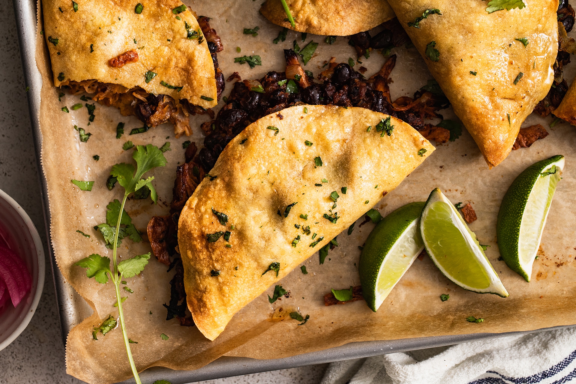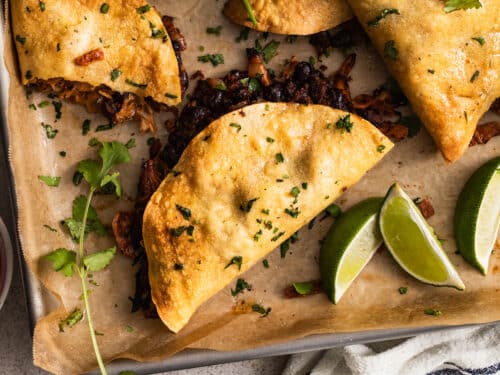 - Assemble the tacos by spreading approximately 2 tbsp of the bean mixture on one half of a tortilla, top with pork and sprinkle with cheese. Fold over the tortilla to make it a half circle. Brush very lightly with a bit of oil and flip so that the cheese side of the taco is down onto the cookie sheet. Lightly brush the other side with oil. Repeat with remaining tortillas.