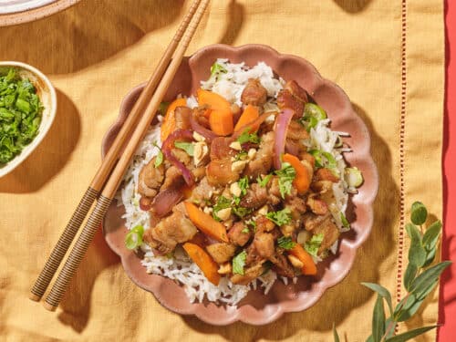 - Sprinkle with peanuts and cilantro and serve over hot cooked rice.