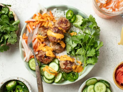 - To serve, distribute rice and meatballs between bowls. Top with pickled veggies, cilantro, cucumbers, sliced jalapenos, pickled ginger and drizzle with spicy mayo, if desired. Enjoy!