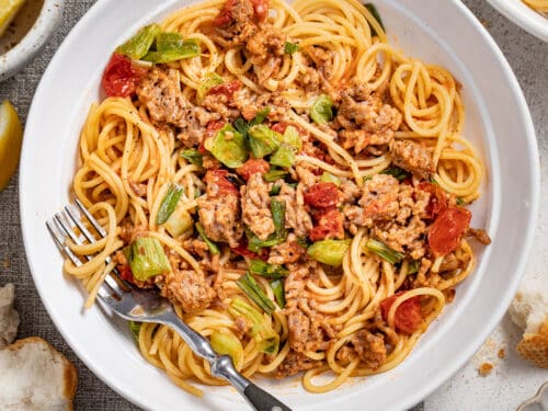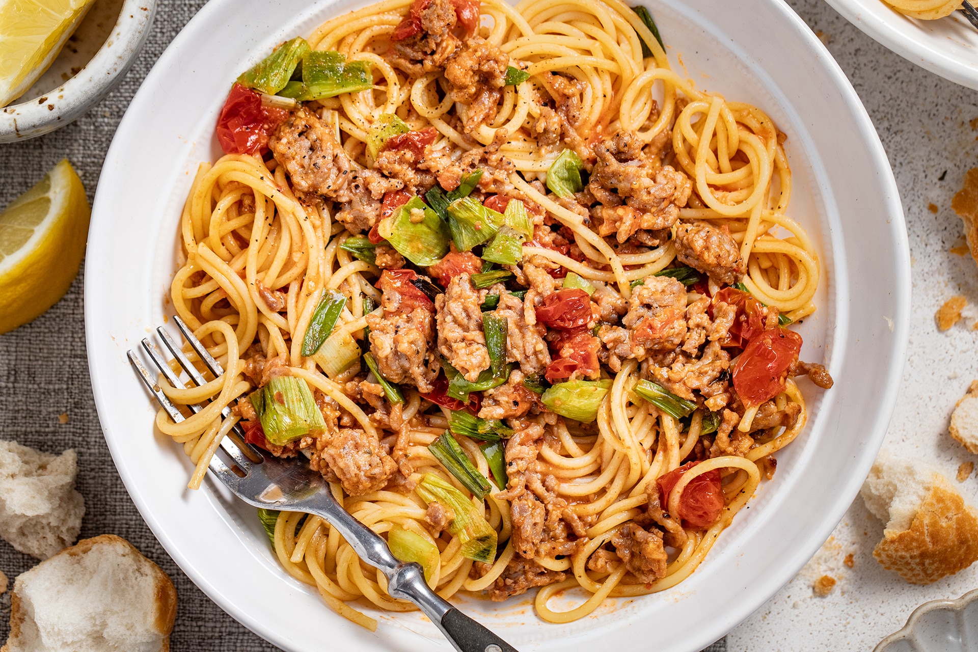 - While the sausage cooks, bring a large pot of water to a boil. Add spaghetti and cook according to package directions. Drain and return to the pot until ready to use.