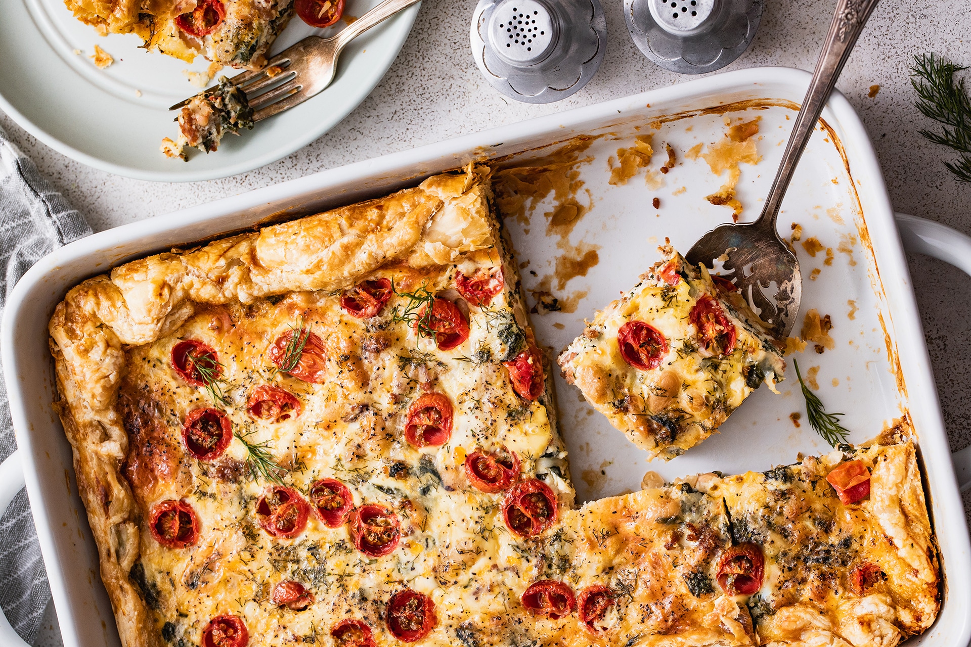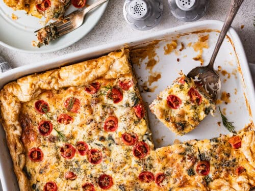 - Lightly coat a 9 x 13” baking dish with oil or cooking spray. Lay the sheets of puff pastry in the dish to overlap by 1-2” in the centre, and press to seal them together. Gently press the pastry up the sides of the dish. Layer the pastry with the drained sausage and bean mixture, and spread a layer of 1/2 cup of cheese on top. Pour the egg mixture over top and gently place the tomatoes cut side up, followed by the fresh dill.