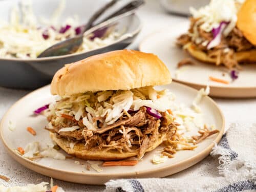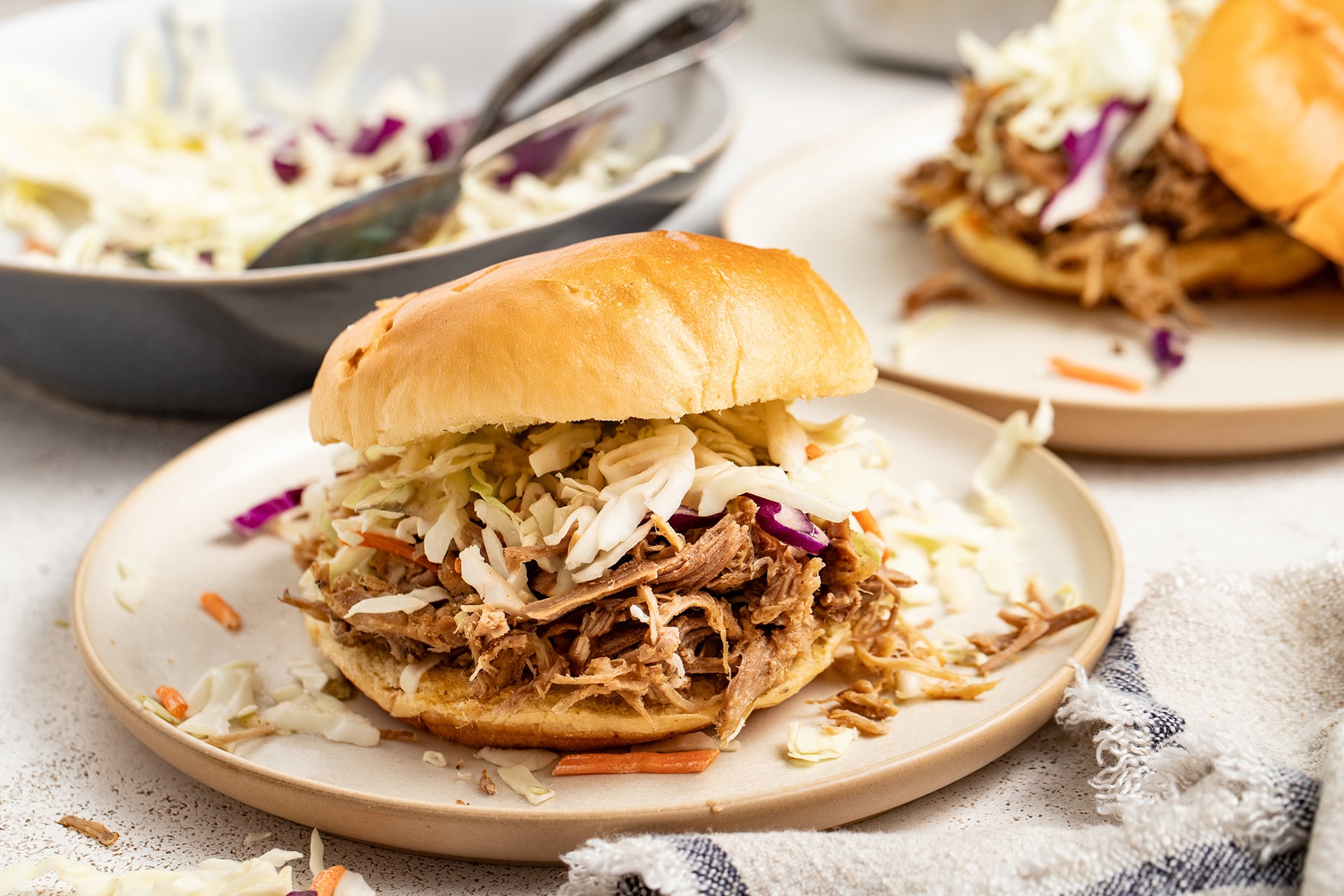 3. Remove pork and drain liquid; remove bone if necessary. Shred pork with two forks, pulling the meat into strands. Mix in BBQ sauce, stirring well to combine. Serve on buns with coleslaw as a sandwich or on small crostini as an appetizer.