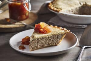 The tourtière can be made up to 2 days in advance and reheated in a 300°F oven.
