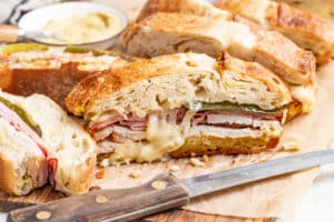 To assemble the sandwich, cut bread in half lengthwise and butter both sides. Pre-heat oven to 350°F. Place layers of sliced pickles, sliced roasted pork, ham, and cheese inside the loaf. Cut diagonally into eight portions.
