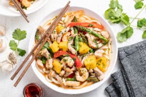 Bright, bold, and full of flavour, this Pork Thai Noodle Bowl brings together tender pork, juicy shrimp, and crisp veggies in a silky coconut curry sauce with a hint of tropical sweetness from mango. It’s a quick and satisfying dish that feels like takeout — but better, and made with love at home. Bursting with colour and inspired by Thai flavours, this recipe is a fresh way to enjoy Alberta pork in a whole new light.